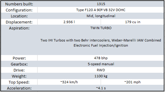 Zawieszenie i aero bazowało wprost na 288 – podwójne wahacze zostały jednak lepiej poustawiane a same części również zastąpiono bardziej udanymi. Dla zachowania wagi wiele elementów silnika wykonano z magnezu. Miska olejowa, głowice cylindrów, kolektor dolotu – były ponad 5 razy droższe, niż gdyby zrobiono je ze stopów aluminium… Ale były lżejsze. Jako, że doładowany silnik generował prze-ogrom gorąca, trzeba było sobie z tym radzić. Elementy aero, liczne wloty powietrza oraz praca chłodnic i intercoolerów – wszystko to było niemal technologią z F1. Pirelli wykonało ogumienie specjalnie do tego modelu wykorzystując wiedzę i doświadczenie z tego formatu właśnie. Auto ważyło mniej niż dzisiejsze Golfy GTI a miało prawie 600Nm momentu obrotowego i prowadziło się stabilnie nawet powyżej 300 km/h.