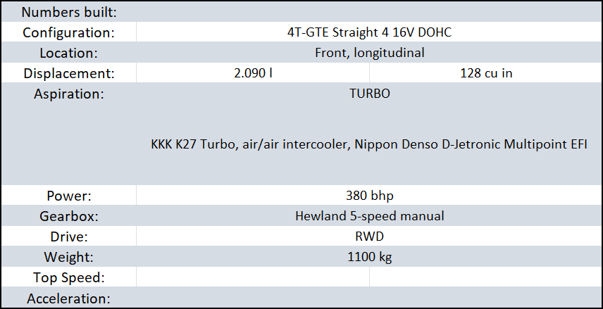 Powstała w Kalifornii Celica Turbo GTO miała chromowo-molibdenowe rurowe podwozie z niezależnym zawieszeniem i była zaopatrzona w nówkę sztukę 4-cylindrową turbo jednostkę DOHC na podwójnym wtrysku. Pojemnościowo było to 2.090 l ale klasyfikowało się jako 3.0 z mnożnikiem 1.4x. Pojazd w konfiguracji używanej przez AAR generował 450 koni i przenosił je na koła dzięki skrzyni biegów Hewland z mechanizmem różnicowym z włókna węglowego. Drzwi i dachu nie ruszano ale reszta również była z lekkiego włókna. Sam kształt nadwozia został dopracowany w tunelu aero i delikatnie zmieniany już po rozpoczęciu sezonu a, w porównaniu do poprzednich Toyot ze stajni AAR, ta wersja była znacznie szersza i mogła śmigać na grubszych kołach. Spojler musiał być zintegrowany – takie zasady. To samo tyczy się dyfuzorów z przodu i z tyłu.