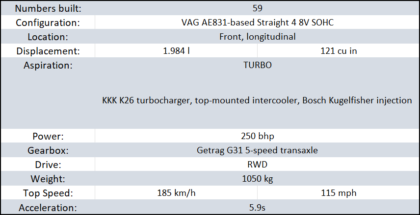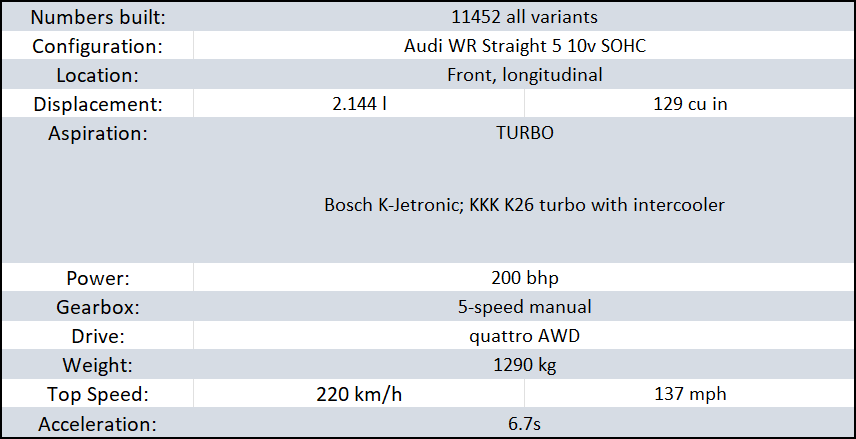 Moc dostarczało 5 szklanek… TAK – 5 (!) – o pojemności 2.1 litra z KKK Turbo. Turbodziura była przepotężna, ale jak wkręcała się pełna moc, to z odbytu nie zostawało nic. 6.5 sekundy do setki nie było problemem – na początku lat ’80-tych! To było lepiej jak dobrze! Miał bardzo osobliwy dźwięk i świetnie podawał moc, a z czasem motor ewoluował do 2.2-litra ze zwiększonym wspólczynnikiem kompresji, oraz 20v o mocy 220 koni, które zmieniały jej charakter kompletnie. W tych, to turbodziury już nie było prawie w ogóle. Takie coś, oczywiście, trzeba było jakoś zatrzymywać – ale Niemcy w standardzie montowali do nich ABS, więc nawet mocny focus hamulców na przód był jak najbardziej do przełknięcia. Co ciekawe – rajdowy odpowiednik miał delikatnie zmniejszoną pojemność silnika, żeby dalej było to 2.1, ale mogło się mieścić w klasie do 3 litrów z turbo.